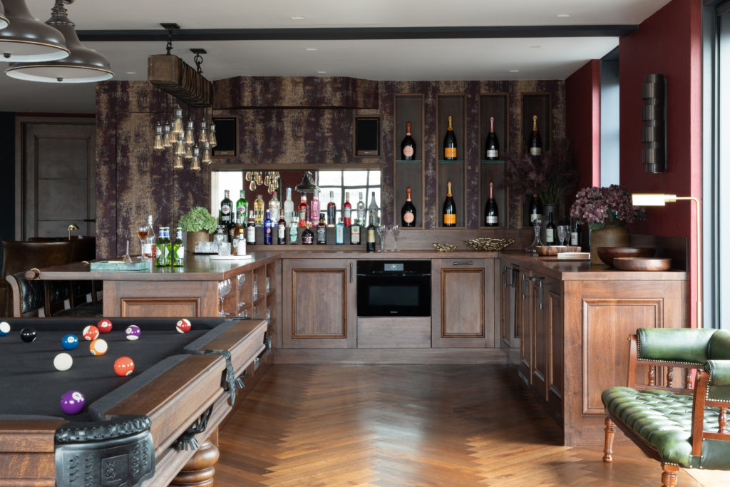 Amenities include: a home gym with top of the range equipment; Bulthaup kitchen with Gaggenau and Sub-Zero appliances; a ‘Light Shower’ sculpture by artist Bruce Munro which hangs from a dramatic glazed pyramid roof above a triple height open plan reception; a sumptuous sports bar equipped with pool table, 3-meter projector screen and a working gas fire; Dolby Atmos home cinema room with fully reclining cherry red leather seats and an integrated trailing light feature.