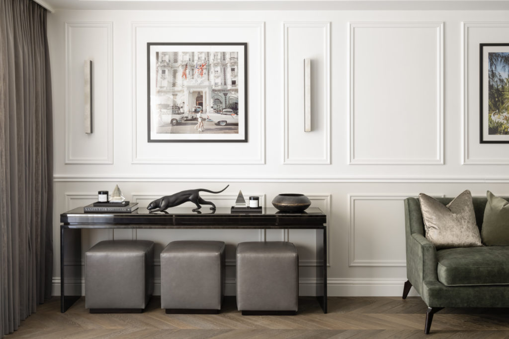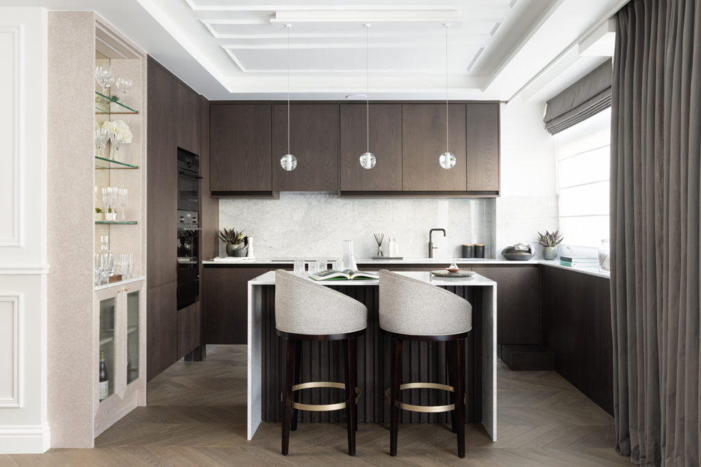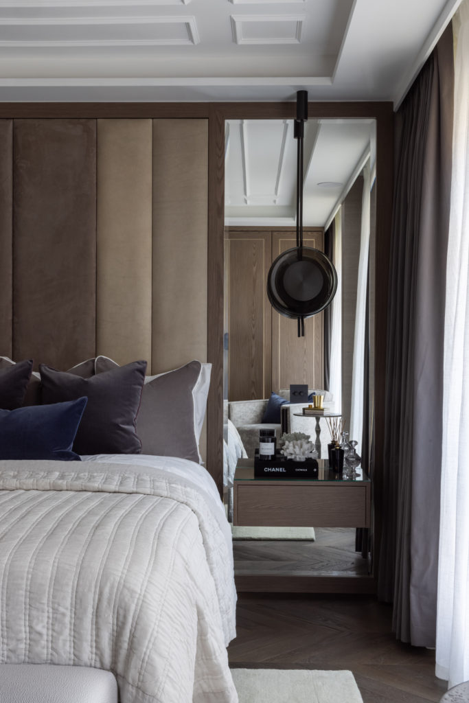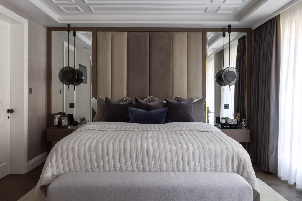The redesign of this property on the Crown Estate reflects a period of transition offering a reinterpreted classical style. Luxury layering paired with a fresh, contemporary palette ensure this beautifully crafted property remains timeless in its aesthetic. Mulberry stained kitchen units are married with two tone panelled walls whilst a nature inspired theme connected the property to the geographical surroundings, Regent’s Park. The lighting design is rich in materiality and adds modern sensibilities and drama throughout the property. Bedrooms feature full height headboards and silk wall coverings whist the bathrooms are clad in Stataurio marble with Pietra Grey worktops. The property delivers a stylish yet cosy, Hotel Suite Home, in the heart of London.