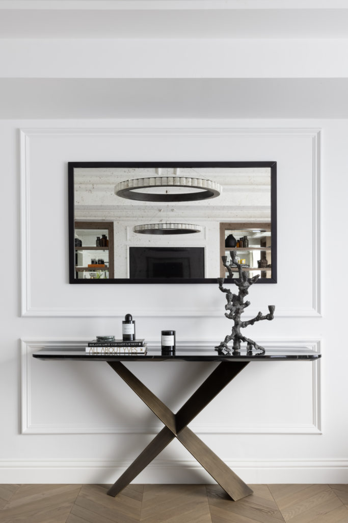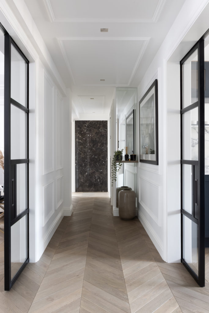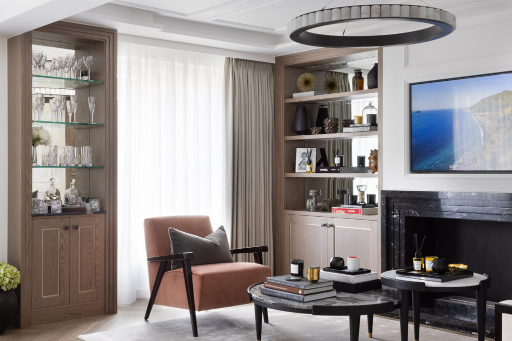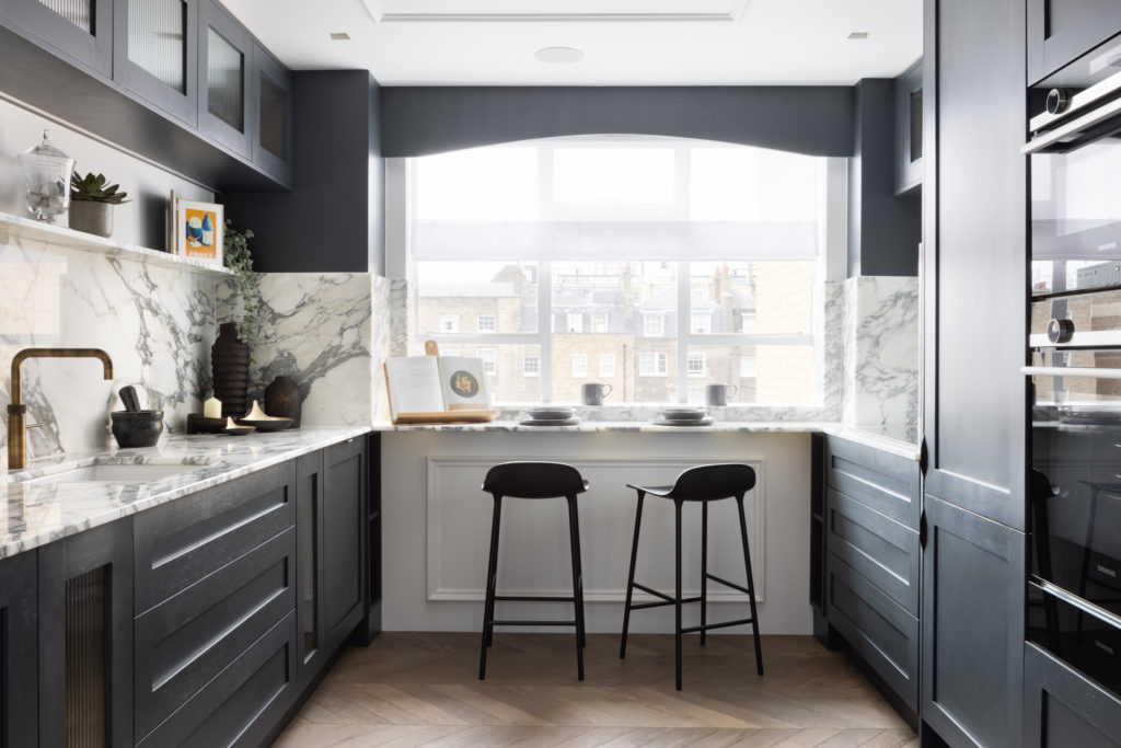 Set in the heart of Portman Village, this elegant dual aspect apartment has been carefully redesigned to our exacting standards. With a focus on high quality materiality, enhancement of traditional features and the creation of a space that is extraordinarily unexpected. A bespoke Nero Marquina fireplace, enveloped by bevelled mirror display units form the focal point within a perfectly panelled reception room. A Bistro style kitchen featuring fluted glass units and Arabestaco Corchia surfaces, including a breakfast bar overlooking a charming cobbled Mews provides a stylish global aesthetic. Chevron flooring, Crittall doors, bespoke joinery, delicate ceiling mouldings and an enviable lighting scheme combine to create sophisticated design on a superior level. Bathrooms are clad in Silver Emperador marble whist the bedrooms feature full height headboards with inset leathers with bronze dividers. A globally sourced and carefully curated furniture scheme ensures a timeless aesthetic.