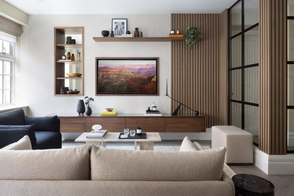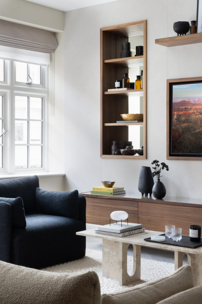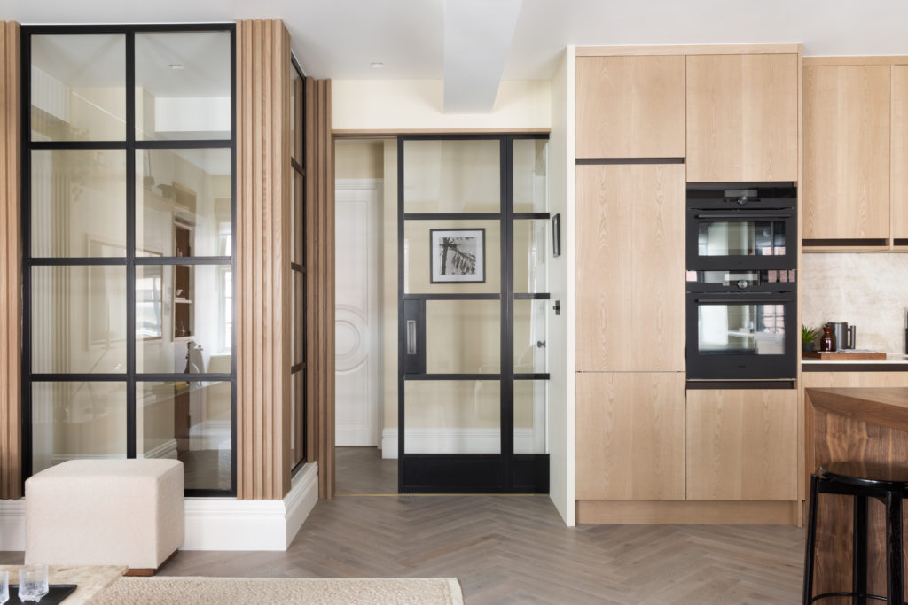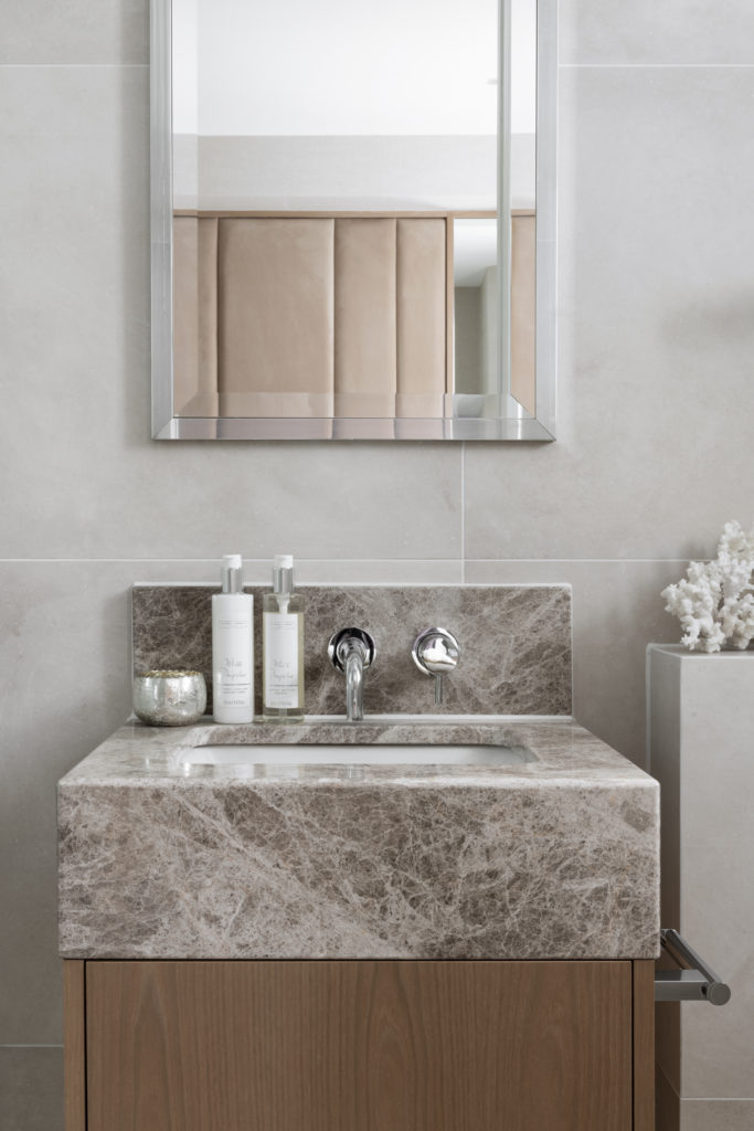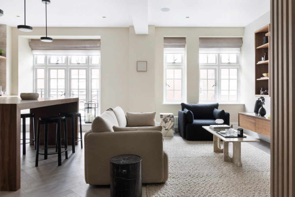 Overlooking London’s iconic Marylebone Villiage, this hotel suite home has been carefully redesigned to our exacting standards. The design concept seeks to utilise the best of open plan, sociable, unrestricted living whilst delivering a sense of calm, comforting cocooning. Full height Crittall-style glazed walls provide openness and light. Most importantly the transparency helps to differentiate the functional spaces, without sacrificing the open feeling of the main living area. A textured stone wall in a warming neural tone is paired with Ash slatting that produces a beautiful pale timber with a grain similar to Oak. Bathrooms are clad in large format concrete tiles with bespoke vanities in Silver Emporador marble. The bedrooms are wrapped in a washed linen wall covering and full height headboards in earthy neutral velvet that compliments the California Sand palette.