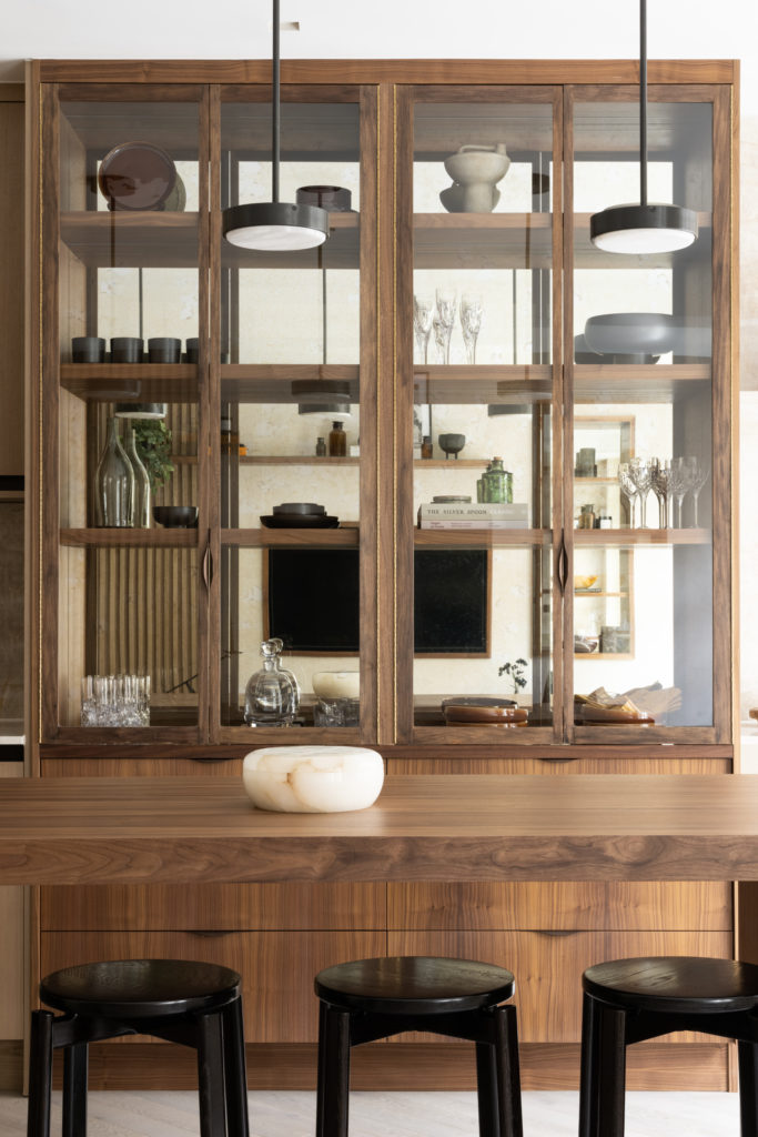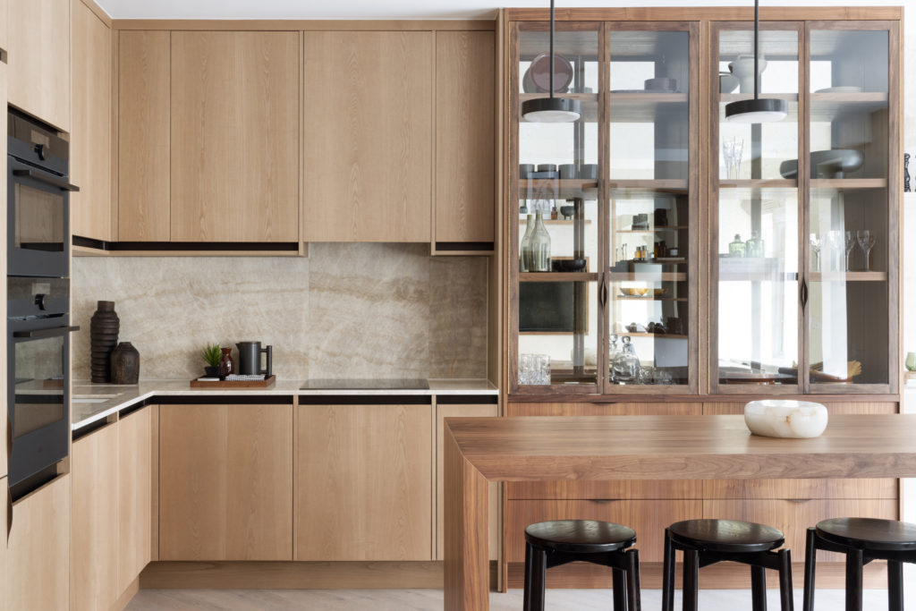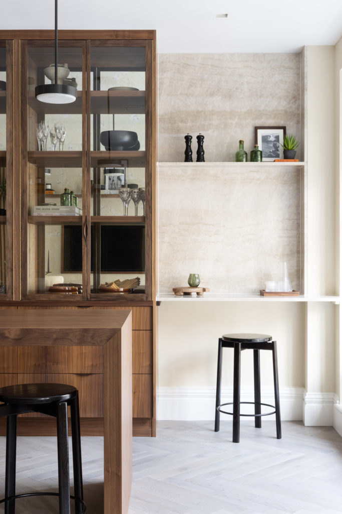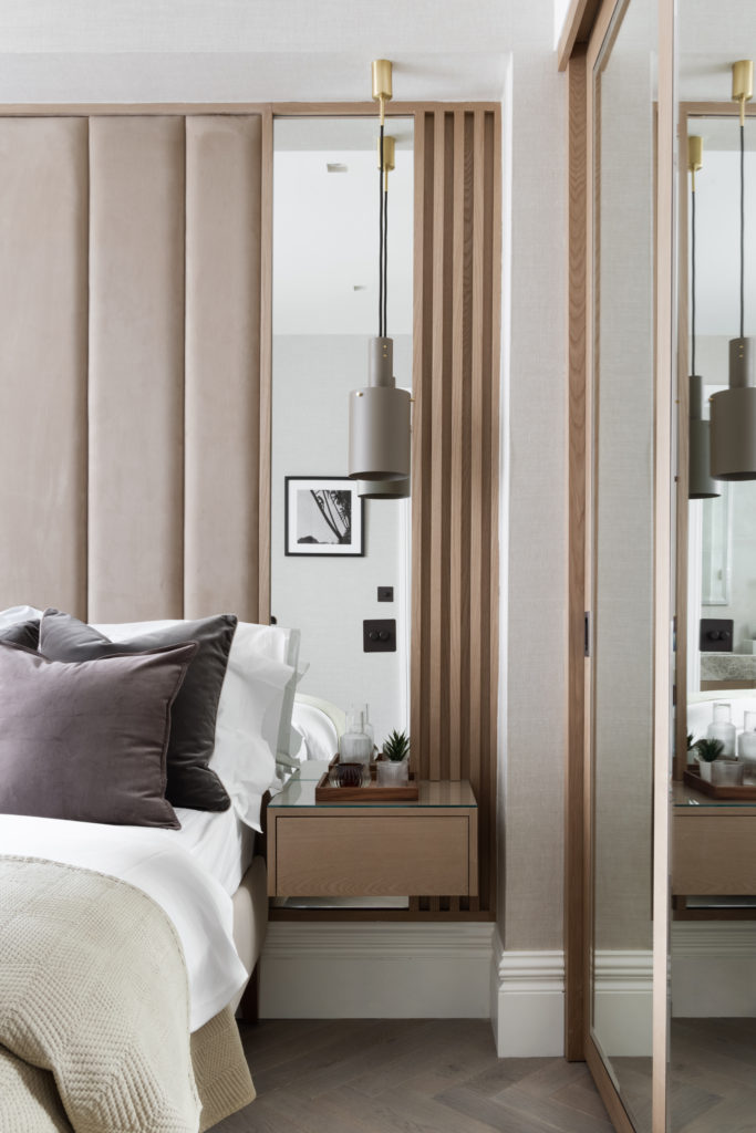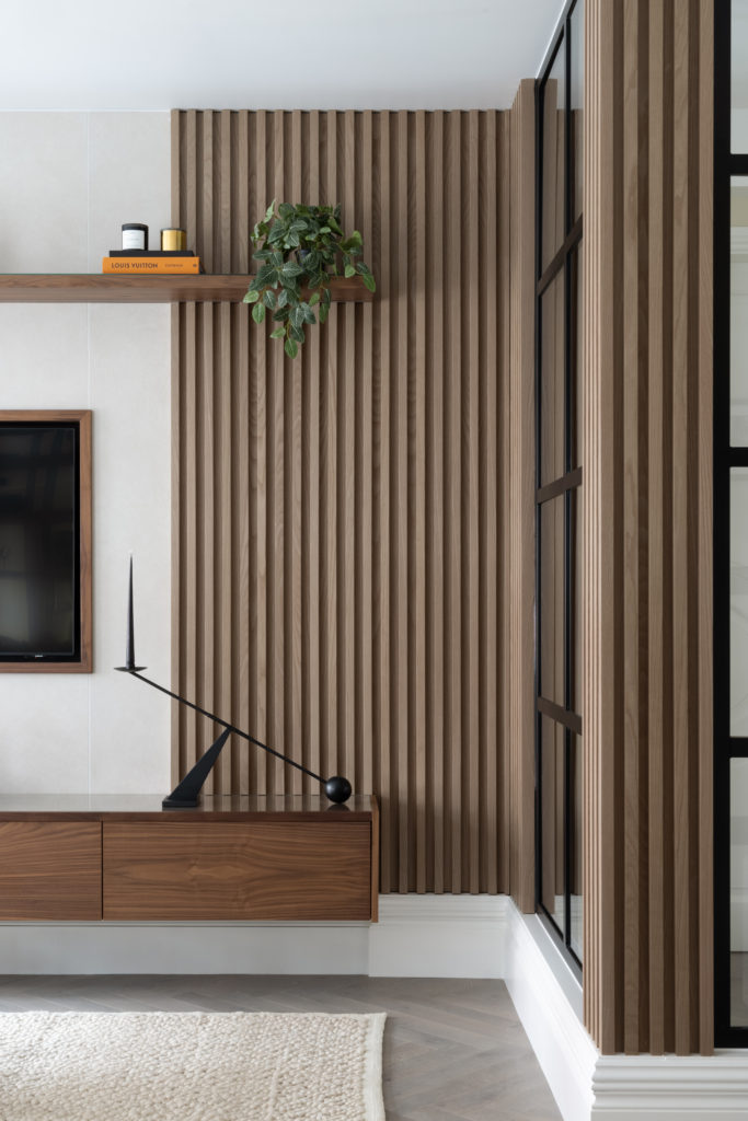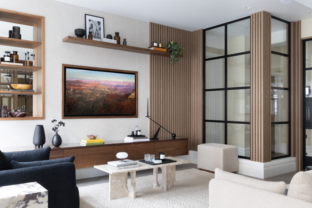 Overlooking London’s iconic Marylebone Villiage, this hotel suite home has been carefully redesigned to our exacting standards. The design concept seeks to utilise the best of open plan, sociable, unrestricted living whilst delivering a sense of calm, comforting cocooning. Full height Crittall-style glazed walls provide openness and light. Most importantly the transparency helps to differentiate the functional spaces, without sacrificing the open feeling of the main living area. A textured stone wall in a warming neural tone is paired with Ash slatting that produces a beautiful pale timber with a grain similar to Oak. Bathrooms are clad in large format concrete tiles with bespoke vanities in Silver Emporador marble. The bedrooms are wrapped in a washed linen wall covering and full height headboards in earthy neutral velvet that compliments the California Sand palette.